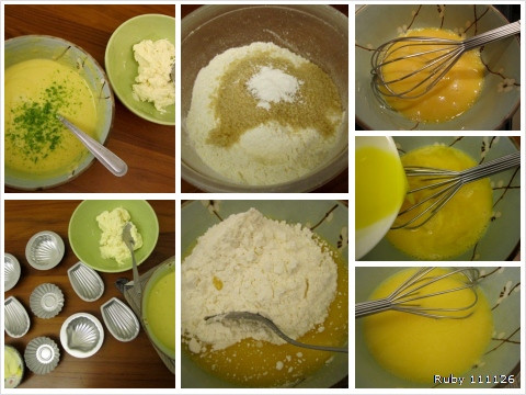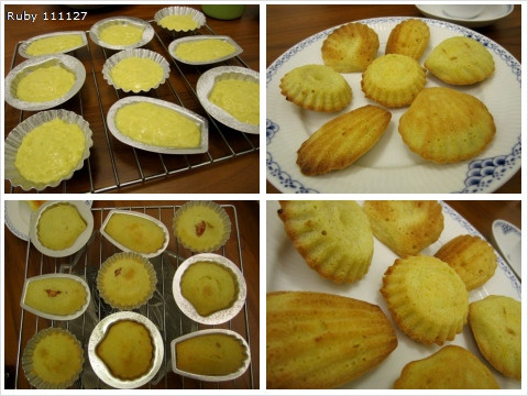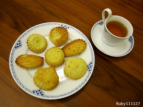 Madeleines是法國的宮廷點心, 貝殼造型, 起源於1730年, 是具有蛋糕口感的餅乾, 最近我好像跟17**年特別有緣, 烘烤後, 上方必須有一個淡金色圓型的隆起肚, 整體需呈現金黃色澤, 外圍有一圈不焦的蜜糖色, 剛出爐則是外酥內軟, 以此描述, 我的色澤….要再調整