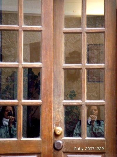 這張照片拍得好!是張很有意思的照片,門上玻璃映出風景還有兩個妳。2008-01-18 01:56