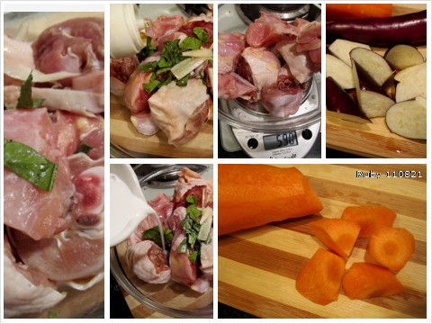 約1斤的雞腿肉, 與少許魚露, 椰漿, 檸檬葉與薑片醃製30分鐘