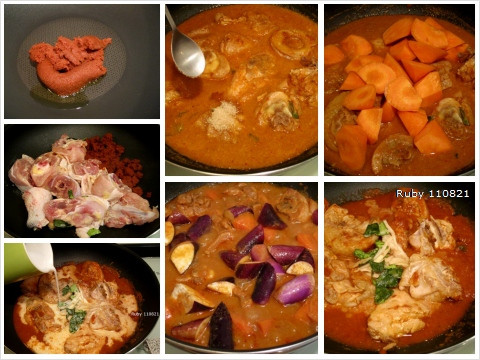 半熟後加入少許水與椰漿與調味的糖燉煮, 依序加入紅蘿蔔與起鍋前的紫茄